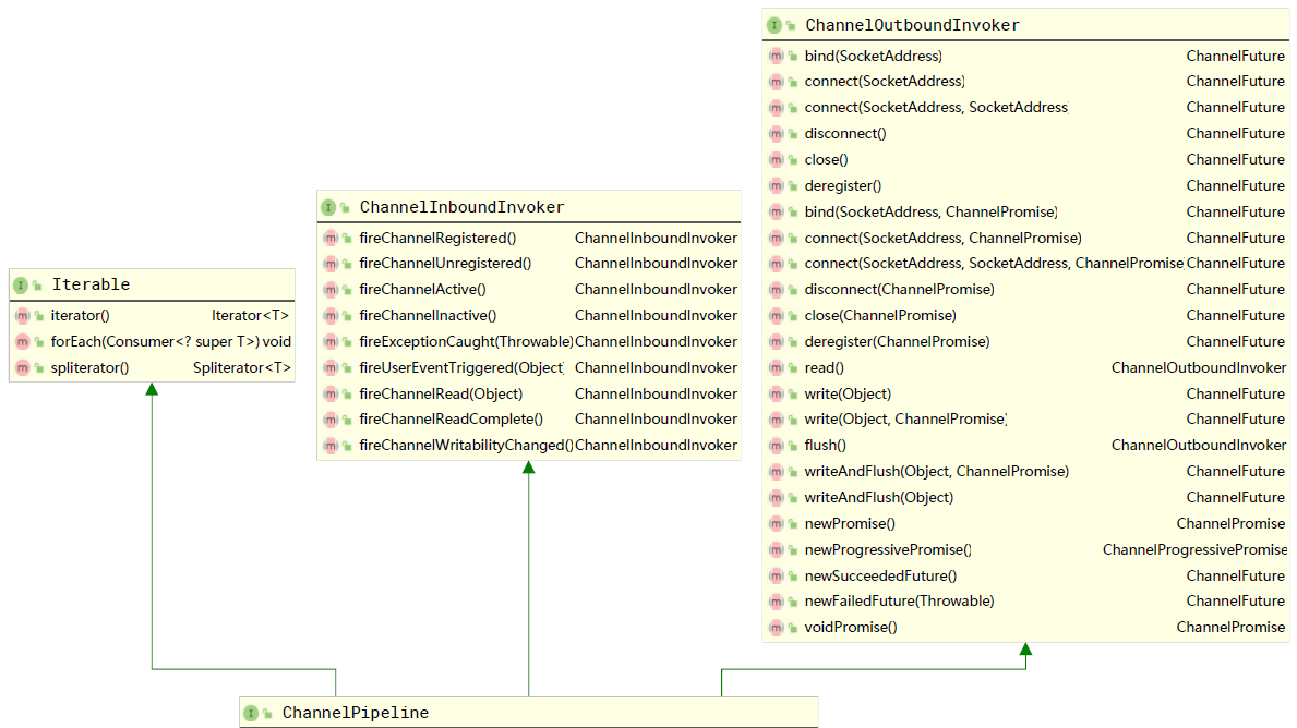 ChannelPipeline接口继承了ChannelInboundInvoker, ChannelOutboundInvoker, Iterable<Entry<String, ChannelHandler>>接口,ChannelInboundInvoker中定义了Inbound事件的方法,ChannelOutboundInvoker中定义了Outbound事件的方法,Iterable用于迭代ChannelHandler。
