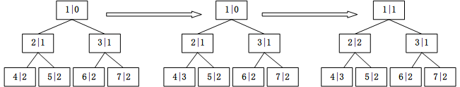 当某个节点被使用时会将memoryMap中的节点高度值改为最大高度加一(maxOrder+1)而depthMap在修改后不变。如下图(节点序号|高度):