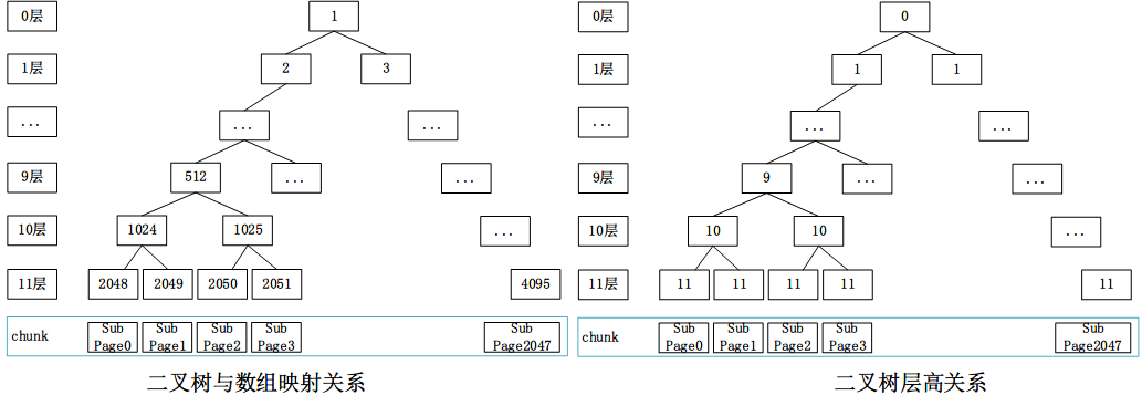 左图表示每个节点的编号,节点从1开始,0被舍弃。这样节点的父子关系更容易计算:子节点加倍,父节点减半,比如512的子节点为1024=512 * 2。右图表示每个节点的高度,从0开始。在代表二叉树的数组中,左图中节点上的数字作为数组索引即id,右图节点上的数字作为值。初始状态时,memoryMap和depthMap相等。